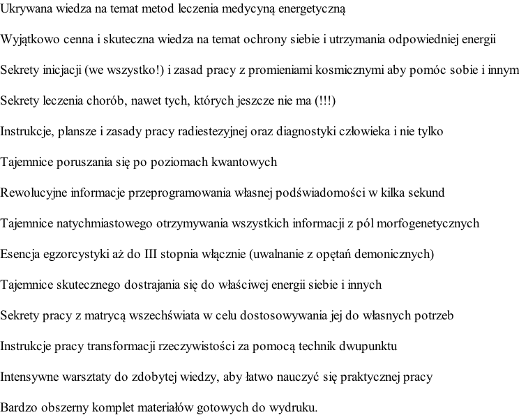 Dwadzieścia lat pracuję jako bioenergoterapeutka, mam świadectwa czeladnicze i masę innych dyplomów, ale po przesłuchaniu Pana kursu najzwyczajniej poczułam się jakbym była zupełnie na początku ścieżki. Uświadomił mi pan przede wszystkim wiele aspektów, o których nikt nigdy mi nie mówił. Nareszczie zrozumiałam na czym tak naprawdę polegała moja dotychczasowa praca i skąd w moim życi wzięło się tak wiele zagadnień, z którymi dopiero teraz mogłam się uporać, dzięki Pana pomocy. Mam ochotę pozdejmować te wszystkie dyplomy ze ścian, ponieważ dzięki panu doszłam do tego, że dyplom nie tworzy umiejętności, ani nie jest ich świadectwem. Liczę na dalsze wsparcie pozdrawiam i dziękuję serdecznie.